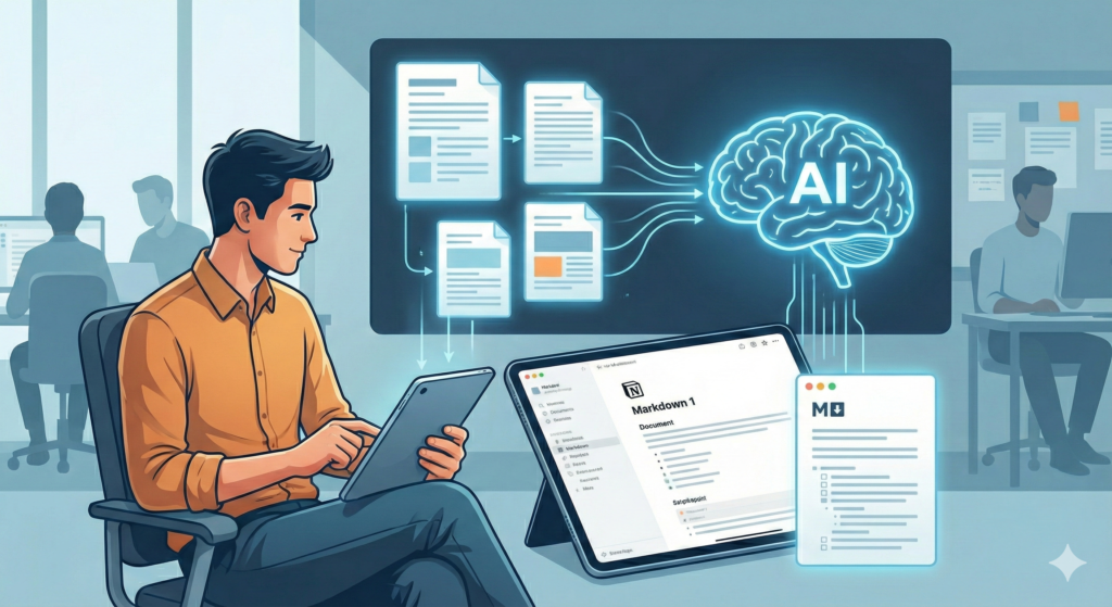 例えば、WordやExcelに依存した従来のドキュメント管理から、NotionやConfluenceのようなWikiツール、あるいはMarkdown形式でのドキュメント作成への移行を推進します。これらのツールは、見出しやリストなどの構造が明確であるため、AIとの親和性が非常に高いのです。