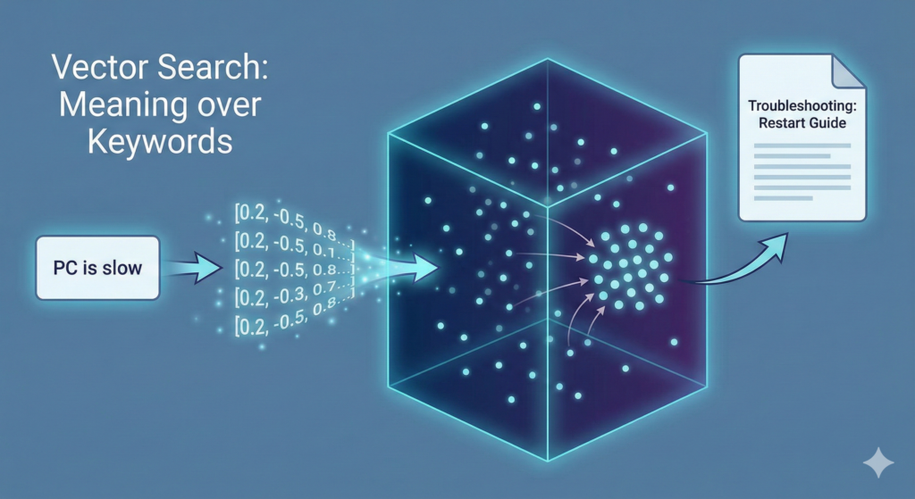 従来のキーワード検索が「単語の一致」を探すのに対し、ベクトル検索は文章を数値の羅列(ベクトル)に変換し、「意味の近さ」で情報を探します。これにより、「PCの調子が悪い」と検索して「再起動の手順」をヒットさせるような、人間的な検索が可能になります。