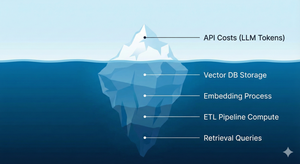 確かに GPT-4o などのモデル利用料はコストの主役ですが、それは氷山の一角に過ぎません。特に、社内データを回答に使わせる「RAG(検索拡張生成)」構成の場合、水面下には以下のようなコストが潜んでいます。