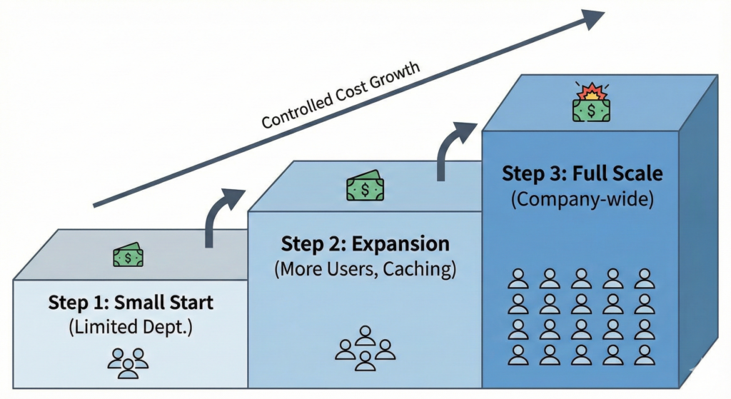 最初から全社員(例:1,000人)対象の試算をすると、月額数百万〜数千万円という数字が出てしまい、経営層がリスクを恐れてプロジェクトを凍結してしまいます。まずは「法務部の契約書チェック(20名)」や「カスタマーサポートの回答補助(10名)」など、効果が見えやすく、利用者が限定的な部署から始めましょう。