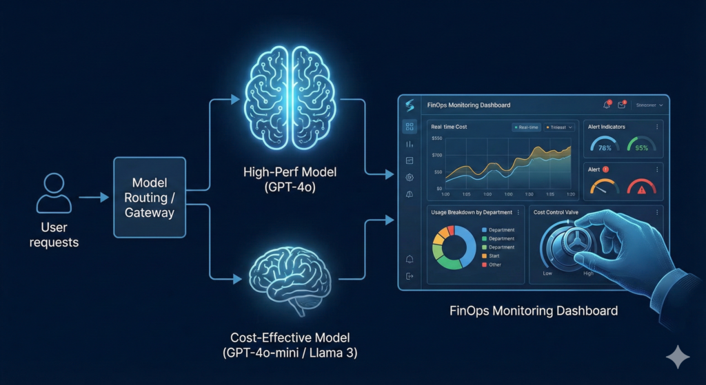 • モデルルーティング(Model Routing): すべてのタスクに最高性能の「GPT-4o」や「Claude 3.5 Sonnet」を使う必要はありません。単純な要約や分類タスクには、安価な「GPT-4o-mini」や「Llama 3」などの軽量モデルを使い分ける仕組みを実装します。これにより、品質を維持したままコストを1/10以下に抑えることも可能です。